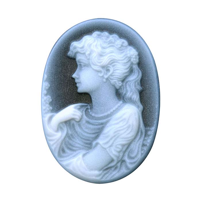 Denne ovale cameo har et smukt detaljeret portræt af en kvindes profil, ultralydsskåret i høj kvalitets sort agat. Den to-lags konstruktion af cameoen gør det muligt for skæreren at fremhæve designets detaljer med subtile farveovergange. Monter en enkelt cameo i en bezel og afslut vedhænget med en lang perlekæde for et moderne look eller en slange- eller ledkæde for et traditionelt udseende. Kombiner større cameo-størrelser med mindre, komplementære cameo-designs for at skabe mere komplekse eller tematiske smykker og sæt. Ultrasonisk skæring sikrer, at detaljerne er nøjagtige fra den ene cameo til den næste, hvilket gør dem ideelle til at skabe gentagelige designs til din produktlinje. Cameo-kvalitets båndet agat udvindes selektivt for at producere cameo-skæringer og farves for at udjævne og fordybe den mørke farve. Glat, jævn hvid bånding giver skæreren (eller ultralydsskæreudstyret) masser af designmateriale at arbejde med for at fange de fineste detaljer og konturer i disse designs. Den sorte farve på agaten giver en mørk, kontrasterende baggrund, der fremhæver disse detaljer.