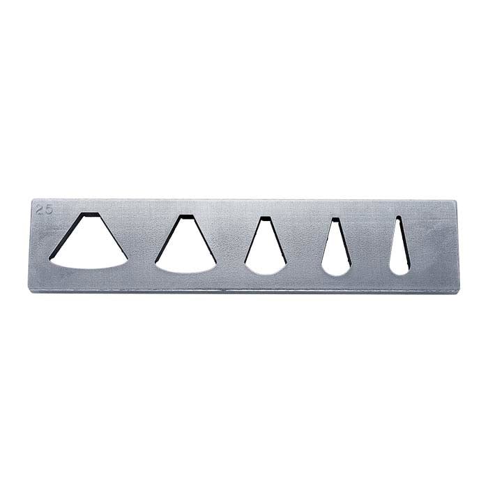 Form a variety of component shapes for your designs—consistently and accurately—with steel silhouette die plates. This plate features graduated shapes—great for creating graduated beads or necklace and bracelet forms. Use with a urethane container to focus all the force into the die plate for accurate volume shapes. Use a 60d urethane for more volume form and less detail; use a 95d urethane for more detail and less volume form. A kit including a urethane container with a stainless steel thumbscrew, a steel pusher, combination pattern die plates #1 and #3 and three urethanes (60, 80, 95d) is also available.Silhouette dimensions (L–R):• 1.25"L x 1.66"W (31.7 x 42.2mm)• 1.28"L x 1.3"W (32.6 x 33mm)• 1.28"L x 0.92"W (32.6 x 23.3mm)• 1.28"L x 0.65"W (32.6 x 16.6mm)• 1.28"L x 0.45"W (32.6 x 11.3mm)