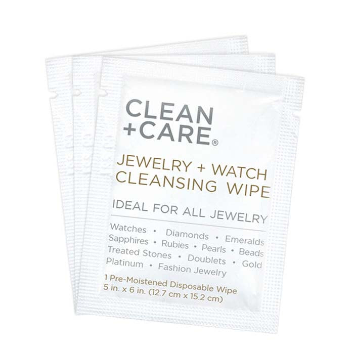 These jewelry cleaner wipes from Clean + Care® effectively remove dirt, oil and grime and are the perfect solution for on-the-go cleaning. The wipes are ideal for use on watches, links and bracelets, and are safe for a variety of jewelry materials including pearls, soft and porous gemstones, enamel, beads and fashion pieces. Each towelette is lightly scented with gardenia and made with an advanced surfactant-based formula that cleans multiple items and leaves your jewelry sparkling like new. The box contains 10 individually wrapped wipes.As one of the fastest growing jewelry care lines on the market, woman-owned Clean + Care® products keep jewelry sparkling like new. Each cleanser is made with a trade-secret formula that is tough on grime and gentle enough on jewelry for daily use.