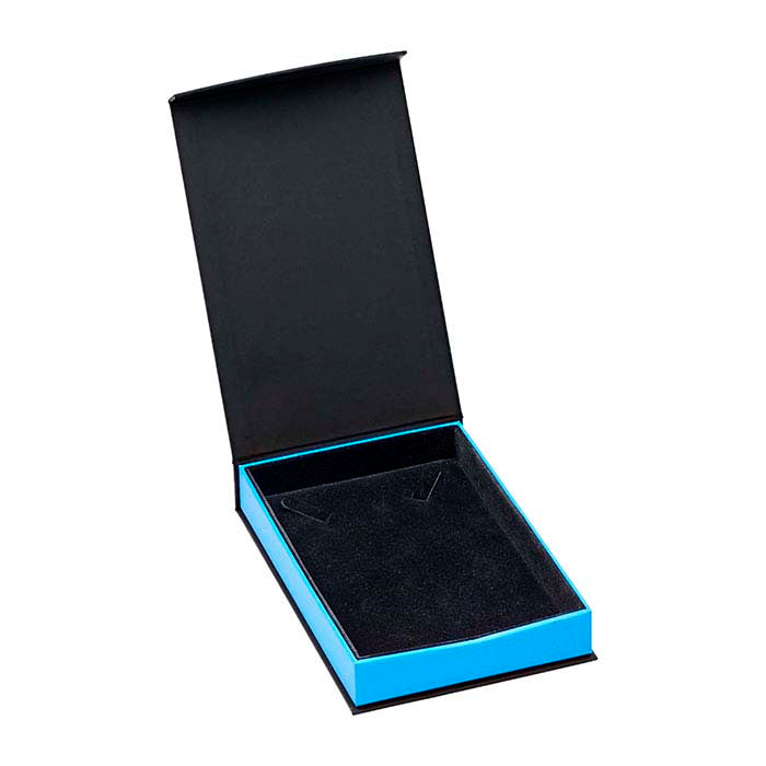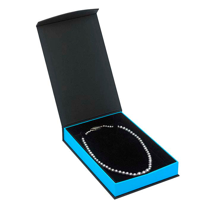 This "Electric Night" bright blue and black necklace box accommodates a necklace or chain. The vibrant, two-tone color scheme and curved-front magnetic flap closure give the box an eye-catching, high-end look. The insert includes flat, covered lugs that secure chain or cord for a professional presentation, and a satin pull-tab makes it easy to lift out of the box without distorting or damaging it. Add a decorative ribbon, gift wrapping or bow (available separately) to customize the box. Smooth paper with a faux-leather look and feel covers the plastic box; the top and bottom of the box are covered with black paper; the sides are covered with bright blue paper. Black paper covers the inside of the lid; black velvet lines the interior sides of the box. The insert is black velvet.