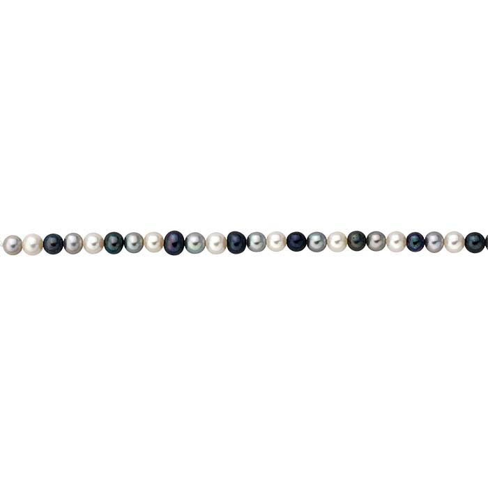 The multi-hued A-grade round freshwater cultured pearls on this strand feature an assortment of black, white and gray colors; ideal for combining with silver findings in monochromatic necklace and bracelet designs. The smooth, oval shape makes them a great choice for traditional designs. For a more dramatic look, separate the strand and use the pearls with other styles and colors of beads—the black, white and gray color of the pearls are a good neutral color for multi-color designs.Freshwater cultured pearls are cultivated in fresh water from mussels, often the triangle shell mussel (Hyriopsis cumingii), that are specially selected for their prolific production of nacre. It is not unusual for a single mussel to produce multiple pearls simultaneously. According to one legend, the pearl was formed from the tears of the goddess of love. For many, pearls are a symbol of pure heart and mind, honesty and integrity.A-grade pearls feature surfaces that show a few insignificant blemishes. Their luster is good, exhibiting some depth.Each package contains one temporarily strung 15"–16" strand.