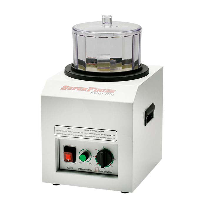 This Super Finish variable-speed pin finisher has a tidy footprint, making it ideal for use in any shop for medium-to-large finishing and tumbling runs—adjust the speed as needed to achieve the ideal finish for your jewelry designs. The 6-1/2" diameter bowl holds up to 50 rings per batch using 225 grams of stainless steel pins and features vertical scalloped walls that help keep the media and the workpieces moving constantly. The revolutionary design of the magnetic head creates a unique agitating action that delivers superior polishing.