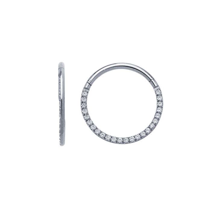 Ideal for your body jewelry line, this clicker is set with 15 round white CZs and is made from biocompatible, implant-grade titanium. The easy-to-use hinged design provides a click sound when the clicker is securely closed.