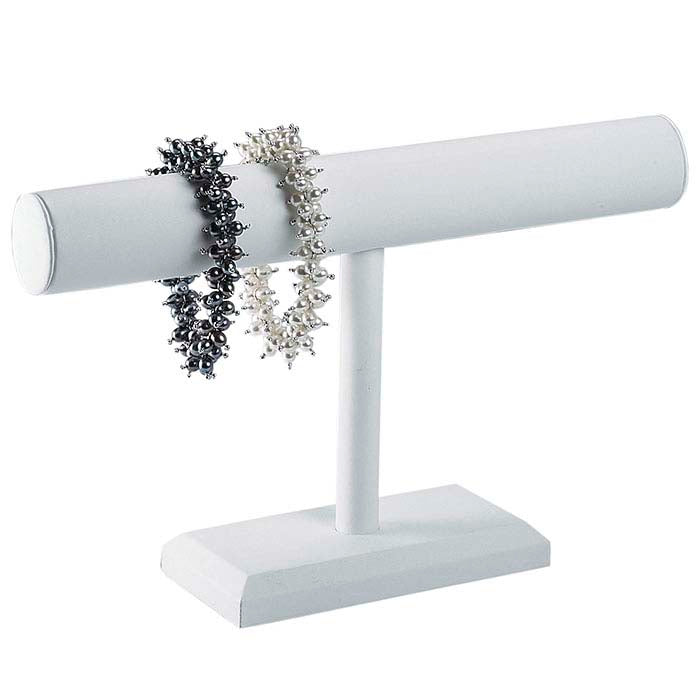 This bar bracelet display is ideal for holding a selection of chains and bracelets at varying lengths. The wide diameter of the round crossbar (1-5/8") effectively shows more of the design of a chain pattern, and the white faux leather presents a sophisticated look that highlights your jewelry designs. Faux leather covers padded wood and cardboard.
