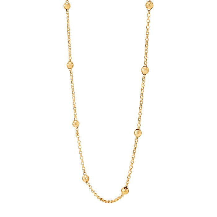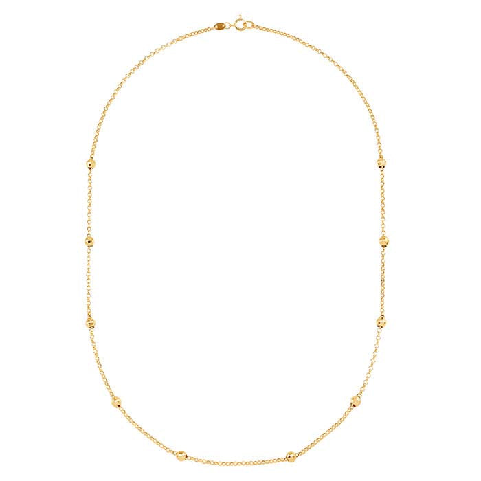 Diese fertige Halskette aus 10-karätigem Gelbgold verfügt über facettierte Perlen, die gleichmäßig entlang der Rolo-Kette verteilt sind. Ein Federringverschluss komplettiert die Halskette.