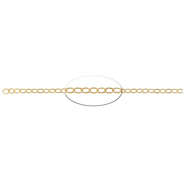 Offer your customers the classic look and rich color of gold at a more affordable price. This 14/20 yellow gold-filled flat oval cable chain is simple yet elegant.This chain is sold by the foot, so it's easy to get the amount you want. Also available on pre-measured 10-ft. or 50-ft. spools.