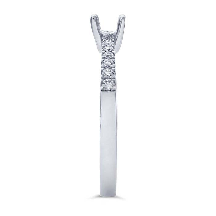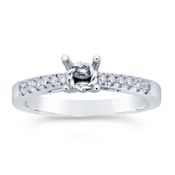 This 14-karat white gold ring features a 4-prong mounting that holds one 4.6mm (0.4-ct., approx.) round faceted gemstone. The shank is set with four 0.025-ct. four 0.01-ct., two 0.02-ct. and two 0.012-ct. round diamonds (SI clarity/G, H color; 0.204CTTW). Cut a seat in the prongs to accommodate your stone, then burnish the prongs over the stone to secure it in place.A classic choice, the 4-prong mounting supports the gemstone on four sides.