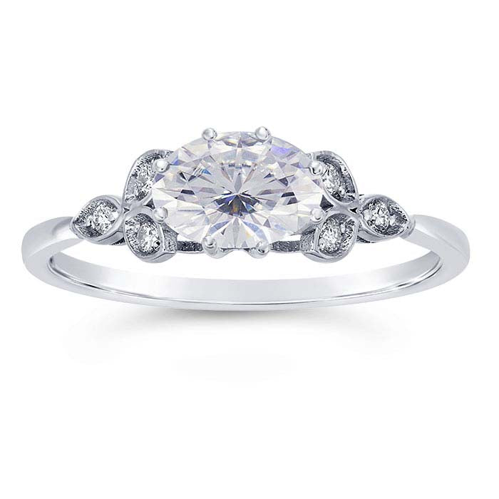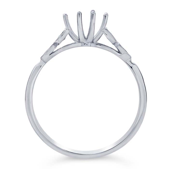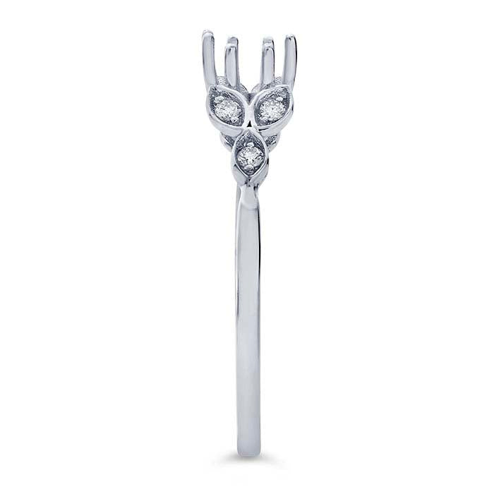 This 14-karat white gold ring features an 8-prong center mounting that holds one 6 x 4mm oval faceted gemstone. The 8-prong setting offers extra security for the set stone. The bright-finished shank is set with 6 0.0125-ct. round diamond (SI clarity/G, H color; 0.075CTTW), three on each side of the center mounting, in oval-shaped embellishments that lend a floral look to the ring. Cut a seat in the prongs to accommodate your stone, then burnish the prongs over the stone to secure it in place.