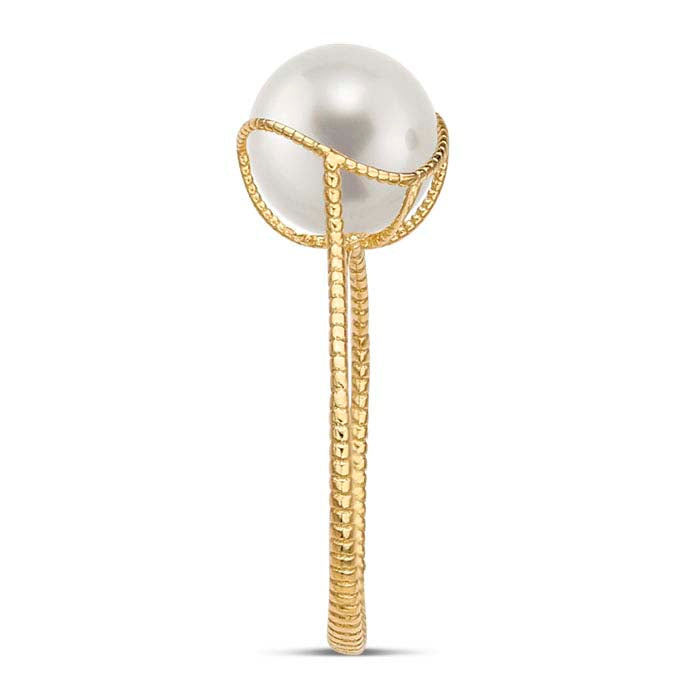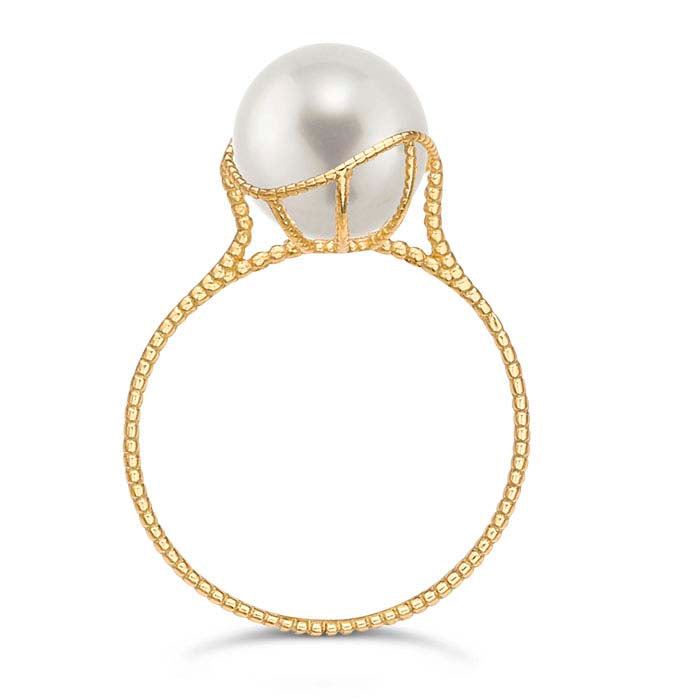 This finished 14-karat yellow gold ring mounting features a delicate, bead-wire filigree design with a twisted pearl peg at the center of an open, concave basket—ready to set with one half-drilled 8mm (or smaller) pearl or gemstone bead. The beaded shank is slightly wider and flatter at the base, graduating from 0.8mm to 1.5mm, making the ring more comfortable to wear; the open design gives the ring a light, airy look. Use jeweler’s epoxy to secure the pearl on the peg; the twisted peg provides more surface area for the epoxy, creating a more secure hold.