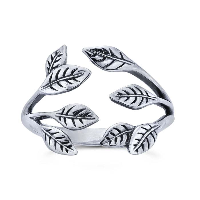 Dieser Sterlingsilber-Bypass-Ring verfügt an beiden Enden über eine Blattgruppe, die oxidiert wurde, um die Details hervorzuheben. Das Bypass-Design erzeugt einen umwickelten Look und ermöglicht kleine Größenanpassungen.