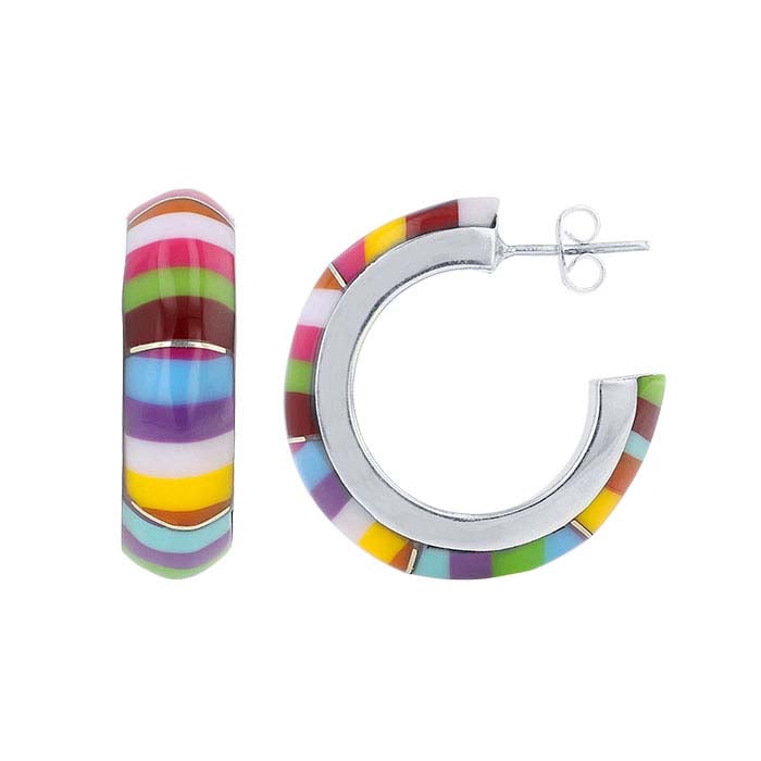 These sterling silver 3/4-hoop earrings feature multi-color resin and synthetic stones. The friction post features a groove that helps provide the most secure and comfortable fit; ear nuts are included. These earrings are ready to sell, ready to wear!