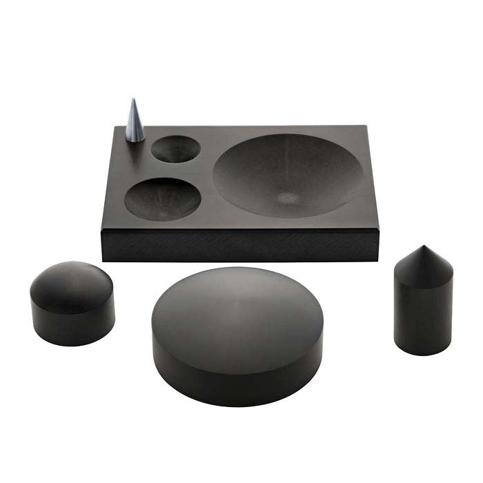 Designed by Deb Karash, the Big Black Block is a versatile addition to any bench and is ideal for forming larger pieces including pendants and adding texture to bracelets. Its size and weight make it perfect for travel or any studio space. The block is made from non-marring Delrin®, will not rust, and can be customized for your specific needs. Made in the USA.• A small divot in the tip of the removable steel pin for adding rivets to your piece while protecting the finished surface.• Two dapping depressions that are ideal for creating domed pieces and adding a slight curve to items before enameling. Matching Delrin® punches are included.• A cone depression, punch and pattern to make perfect cone shapes.• A flat bottom for flattening, texturing and stamping.