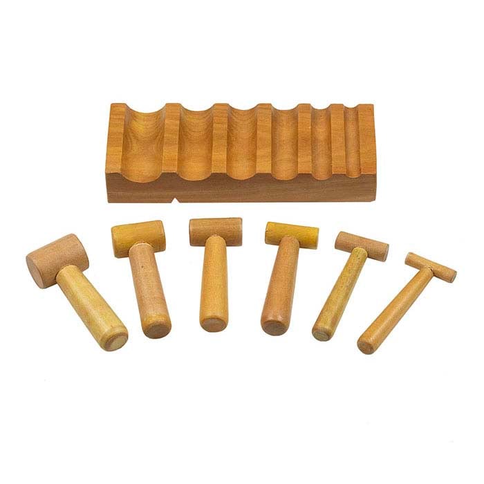 Dieser Form- und Biegeblock aus Hartholz (165 x 60 x 25 mm) enthält sechs 80 x 30 mm große Hammerstempel mit Kopfdurchmessern, die zu den U-Kanälen im Block passen. Der Block hat sechs U-Kanäle, die Breiten sind: