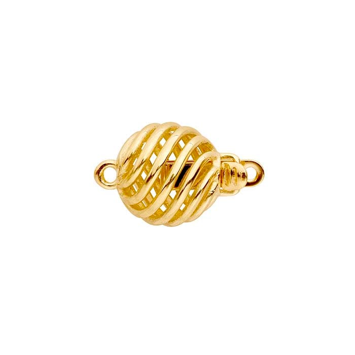 Ideal for use with pearl strands, this 14-karat yellow gold round safety clasp features an eye-catching open twist pattern. Its elegant styling makes it a great choice for a wide variety of necklaces and bracelets. Safety clasps (also called pearl clasps) feature two parts that connect in two different ways, providing a fail-safe that helps prevent loss of higher-value necklaces or strands and are ideal for pearl and gemstone strands. The interior part of the clasp is a slender hook with notches along the outer edge; the exterior part is hollow except for a locking bar. The interior part hooks over the locking bar and then slides inside the exterior part, the notches catching along the inner sides to hold the clasp securely closed. Even if the notches fail for any reason, the hook keeps the strand in place.