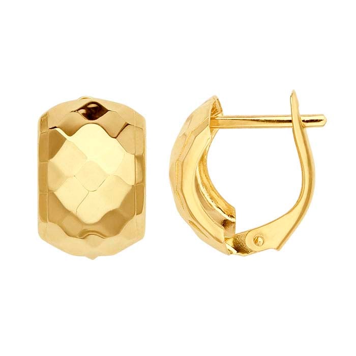 This 14-karat yellow gold lever-back earring features a half-hoop design highlighted with a bright diamond-shaped pattern. The hinged closure helps protect against loss. A short, straight length of wire goes through the ear; the end of the lever is designed with a hole, perfectly sized to accommodate the wire. Simply close the lever, capturing the wire in the hole, securing the earring in place.