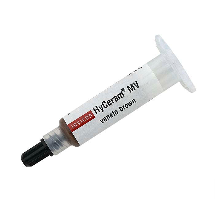 HyCeram® is a hybrid ceramic and polymer material formulated and manufactured in Austria by Invicon; its viscosity can be adjusted somewhat to allow precision placement on both flat and domed surfaces—even into crevices and hollows. Choose medium viscosity (MV) for flat pieces, shallow domes or curves, and for covering or filling small crevices; choose high viscosity (HV) for round or domed pieces. Please check to ensure that you order the appropriate formula.