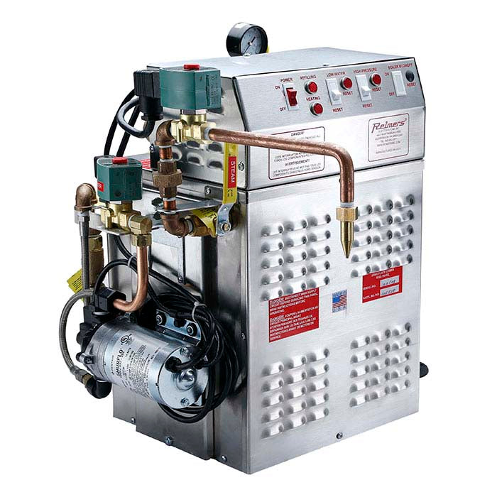Ideal for manufacturing environments and production cleaning, this automatic-feed steamer is ready throughout the day for any cleaning job; unit hooks directly to your water supply, so there’s no downtime to fill the tank and wait for the water to heat up. The optional parts catcher tray prevents dropped pieces from hitting the floor. Drain valve, pressure gauge, safety valve, visible water gauge, adjustable thermostat, true-mist jet nozzle, low-water cutoff. Pressurized steam. Pressure: 5–85psi, factory-set at 60psi. Time to steam: 40 minutes from cool state. Electric foot pedal operation. Stainless steel, 20-gauge cabinet. • ASME CSD-1 and UL-certified. • Shipping weight: 83 lbs.