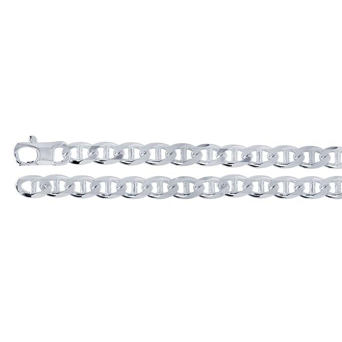 This bracelet is made with 8mm diamond-cut anchor chain. With a substantial, light-catching look, the bracelet can be worn alone or used as a foundation for charms, beads and other design elements.Anchor chain features oval links that are often, though not always, bisected across the center; the links tend to be thick in proportion to their size. Diamond-cut versions have facets precision-cut into the links with diamond-tipped tools. The facets are then polished to enhance the light-reflecting properties of the link surfaces.