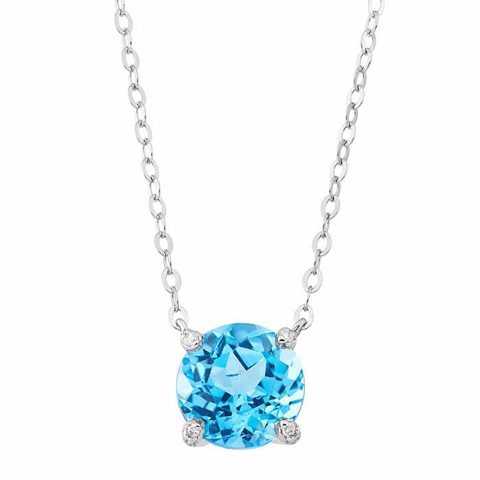 This finished 10-karat white gold necklace features a pendant that is set with one 8mm round Swiss blue topaz faceted gemstone in a prong setting; the prongs are accented with round white diamonds (I3 clarity/H–I color; 0.026CTTW). The necklace is completed with a spring ring clasp.