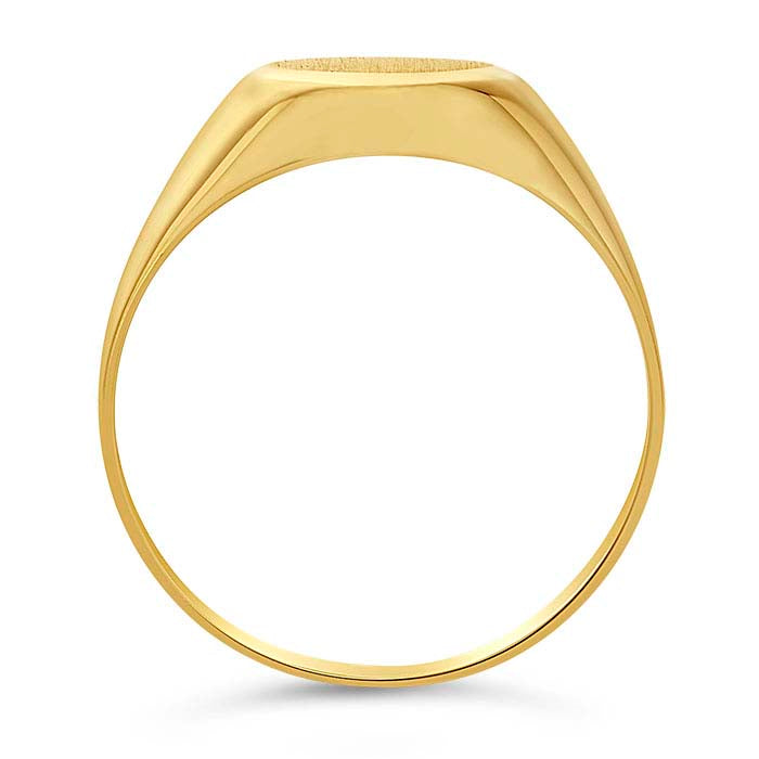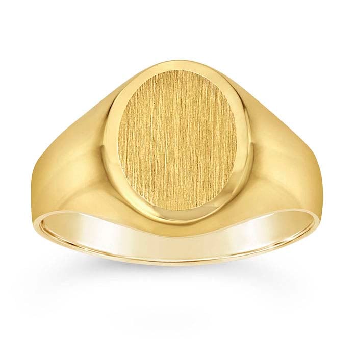 This 14-karat yellow gold signet ring features an 11 x 9mm oval signet with a brushed finish and a brightly finished band. The ring is ideal for customizing with a monogram, initials or other decorative design. The signet is hollow, reducing metal weight and material costs.