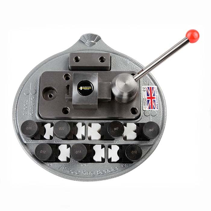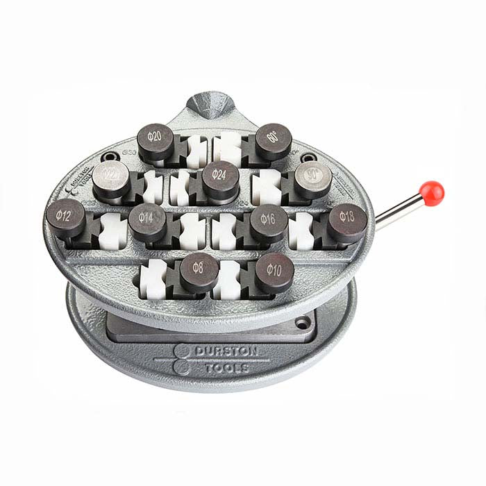 Built with Durston’s award-winning design and engineering expertise, this ring bender set allows you to easily create curves and angles in ring sizing stock or metal strips up to 2mm (0.078") thick. The bending tool offers 11 shaped forming steel and non-marring Delrin® die pairs that are stored in an elevated marked tray that is above the bender on an attached pivoting post. Each tool steel die die is hardened to 52 HRC and is finely finished to reduce marring metal surfaces. The tray easily swings completely out of the way during use. If desired, the bender may be secured permanently to your bench using the holes conveniently cast into the base (hardware is not included). This set includes 20 dies: • Two sets (one steel, one Delrin®) of nine round dies: 8, 10, 12, 14, 16, 18, 20, 22, 24mm diameter • Two sets (one steel, one Delrin®) of two angled dies: 60° and 90°.