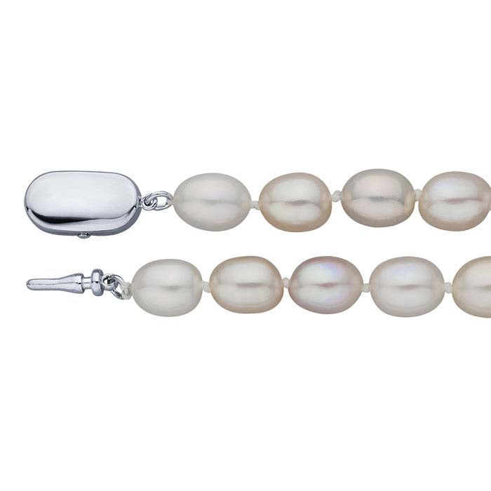 Esta pulsera de perlas terminada presenta perlas ovaladas blancas naturales de 7.5–8mm. Está terminada con un cierre de liberación por presión de plata de ley que está chapado en rodio.