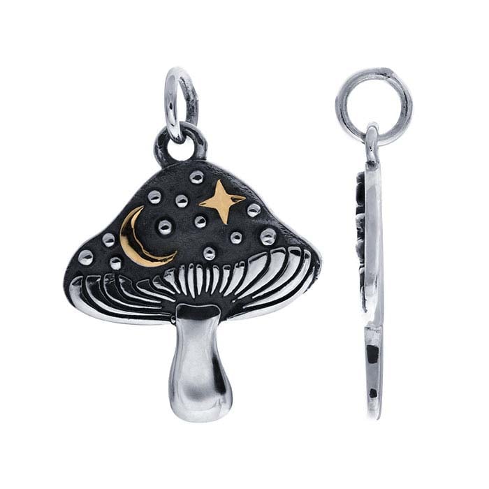 Este charm de plata de ley presenta una forma de hongo; el tallo tiene un acabado brillante y la parte superior cuenta con una luna creciente de bronce brillante y varias "estrellas" de gránulos brillantes dispersas sobre un fondo oscuro y oxidado. La oxidación proporciona contraste y un efecto dramático de cielo nocturno. El charm es una excelente adición para una pulsera o un diseño temático y funciona bien como un colgante simple para pendientes. Se incluye un anillo de salto.