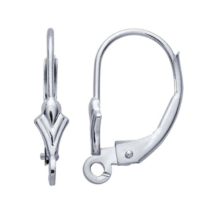This 14-karat white gold lever-back ear wire features a fleur-de-lis design on the front and a ring for attaching drops or dangles. The hinged closure helps protect against loss. A short length of open channel perfectly sized to accommodate the wire. Simply insert the wire and close the lever over it to secure the earring in place.