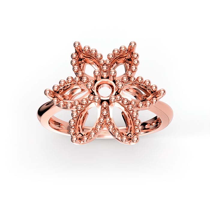 Tämä 18 karaatin ruusukultainen sormuksen kehys sisältää keskellä 6-piikkisen asetuksen, joka pitää yhtä 3,5 mm (noin 0,15 ct) fasettihiottua jalokiveä. Kuusi 2-piikkistä asetusta, jotka kukin pitävät 5 x 3 mm marquise-hiontaista kiveä, ympäröivät keskikehystä muodostaen kukan. Leikkaa istuin piikkeihin jalokivillesi ja kiillota piikit kivien päälle kiinnittääksesi ne paikoilleen.