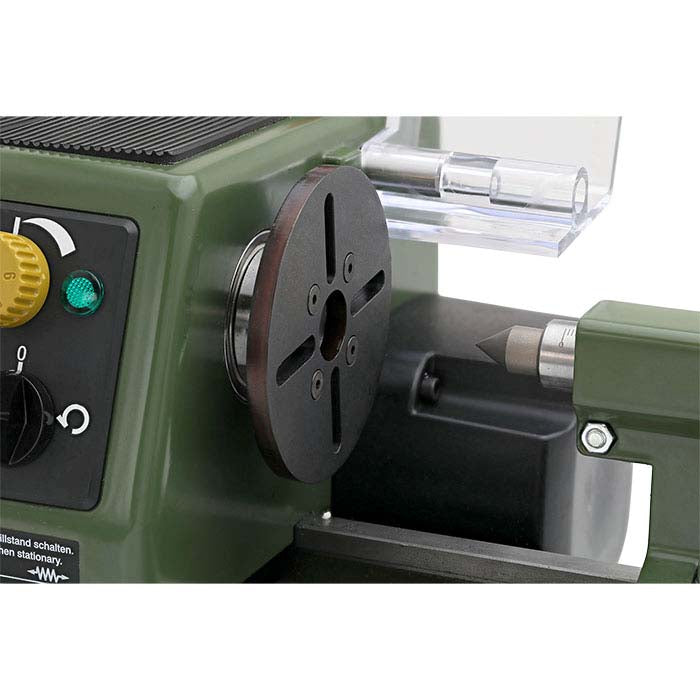 This center turning attachment fits the Precision PD 250/E lathe. It keeps your workpieces running with high rotational precision. Includes a face plate, two fixed centres (MK 2 and MK 1/short) and one drive dog.