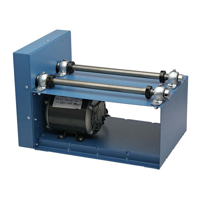 This all-steel rotary tumbler base with a 1/3hp motor (single-speed 30rpm) accommodates various barrels. Designed for dependable service with pillow block bearings and a pulley housing for safety.