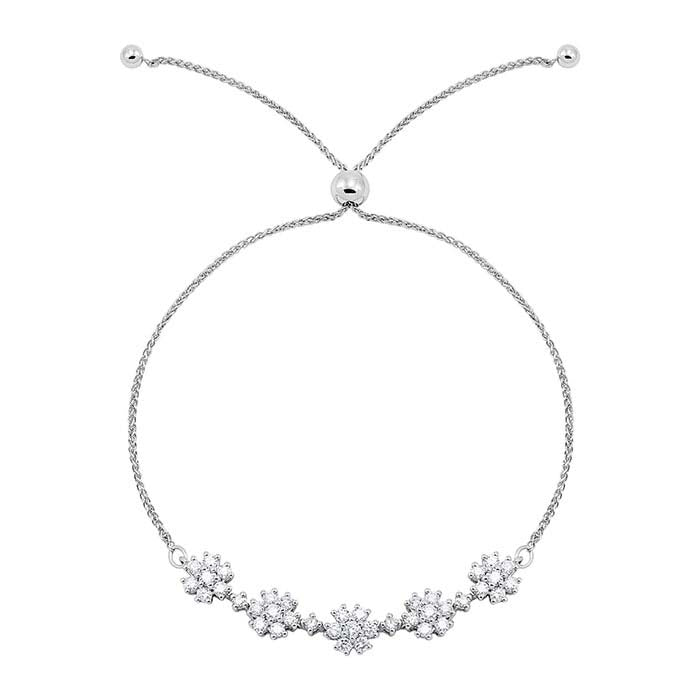This sterling silver rolo chain bracelet features flower that are set with several round white diamonds (0.035,- 0.021-, 0.015- and 0.025-ct., I2–I3 clarity/G–I color; 1CTTW). It looks great on its own or as part of a stacked look. The bracelet is finished with a silicone-lined bead that allows your customers to adjust the chain length. It includes a ".925" sterling silver stamp as a symbol of guaranteed product quality.