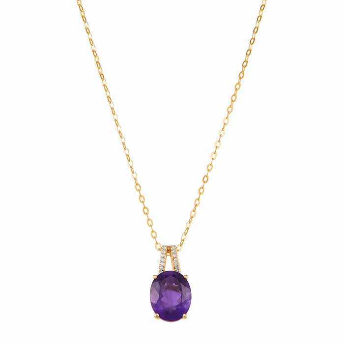 This finished 10-karat yellow gold necklace is set with one 10 x 8mm oval amethyst faceted gemstone. The bail is set with several round white diamonds (I3 clarity/I–J color; 0.035CTTW). A spring ring clasp completes the necklace.
