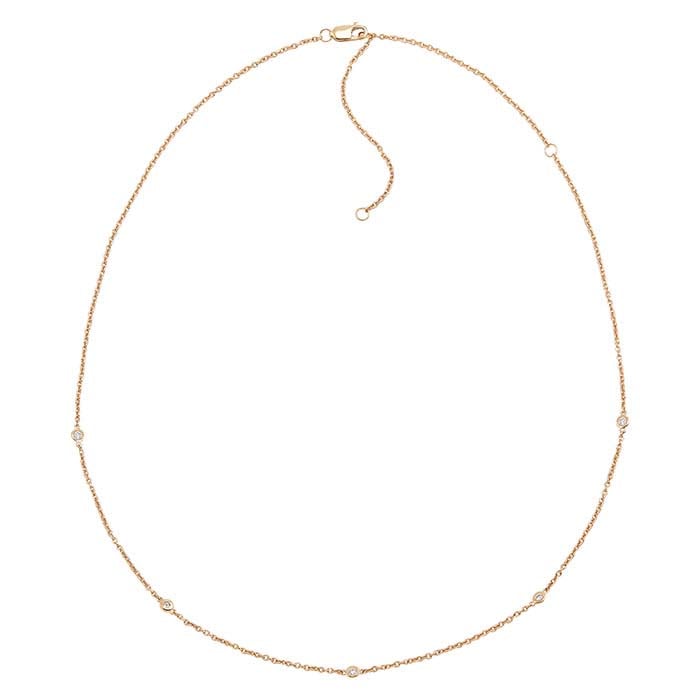 שרשרת זהב צהוב 14 קראט גמורה זו כוללת חמישה תחנות שכל אחת מהן מעוטרת באבן יהלום עגולה לבנה אחת המונחת בתוך מסגרת (נקיות I2/צבע G–H; 0.15CTTW) על שרשרת כבל. לשרשרת יש טבעת קפיצה באורך 14" ו-16" להתאמת אורך, והיא מושלמת עם אבזם לובסטר.