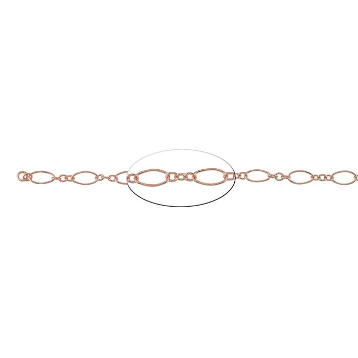 This stylish 14/20 rose gold-filled long & short chain offers the appealing color of rose gold at an affordable price point; the generous oval links create a great connection point for drops and dangles. This gold-filled chain is plated with 14-karat rose gold to ensure a uniform color. Long & short chains feature one long link alternating with one or more shorter links. In this chain, long oval links alternate with groupings of three small round links. This chain is sold by the foot, allowing you to have exactly the length you need when you need it.