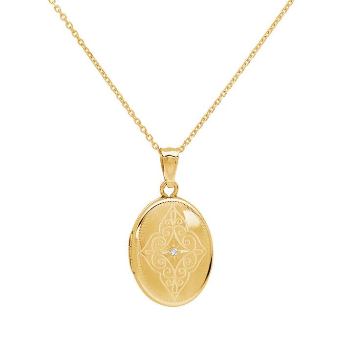 This 14-karat yellow gold necklace features a 26.8 x 14.9mm oval locket pendant with a star in the center and is set with one 0.005-ct. round white diamond (I1 clarity/G-H color) on a 1.1mm cable chain.The most common chain style, cable chains are formed by simply connecting single links perpendicularly end to end. Links may be round, oval or other shapes.