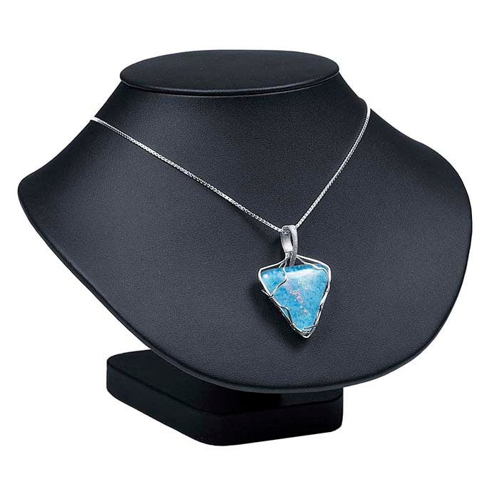 यह नेकलेस बस्ट एक या अधिक नेकलेस या विभिन्न लंबाई की चेन को धारण करता है; क्लासिक काले फॉक्स लेदर विभिन्न प्रकार के आभूषण डिजाइनों के लिए एक आदर्श पूरक है, जिसमें मोनोक्रोमैटिक धातुएं और चमकीले रंग के मनके और स्ट्रिंग डिज़ाइन शामिल हैं। बस्ट की यथार्थवादी आकृतियाँ नेकलेस और पेंडेंट को प्राकृतिक ढंग से लटकते हुए दिखाती हैं, ताकि ग्राहक देख सकें कि आभूषण पहनने पर कैसा दिखेगा; फॉर्म के पीछे दो टैब और एक माउंटेड आईलेट नेकलेस को आदर्श लंबाई पर सुरक्षित करते हैं और अतिरिक्त चेन को पेशेवर प्रस्तुति के लिए पकड़ते हैं। काला फॉक्स लेदर पैडेड लकड़ी और कार्डबोर्ड को कवर करता है।