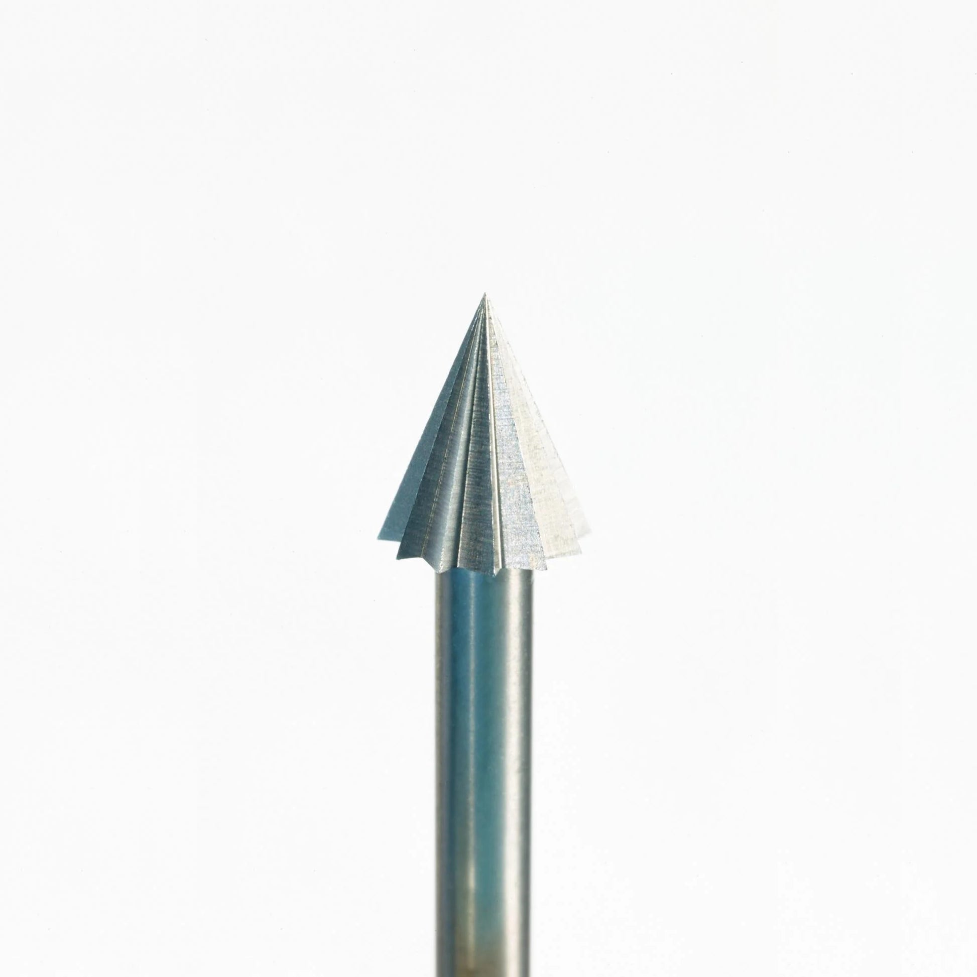 क्रॉस-कट बर्स में कटिंग सतह पर सामान्य फ्लूटिंग के बजाय दांत होते हैं; बहुत आक्रामक सामग्री हटाने के लिए आदर्श।
