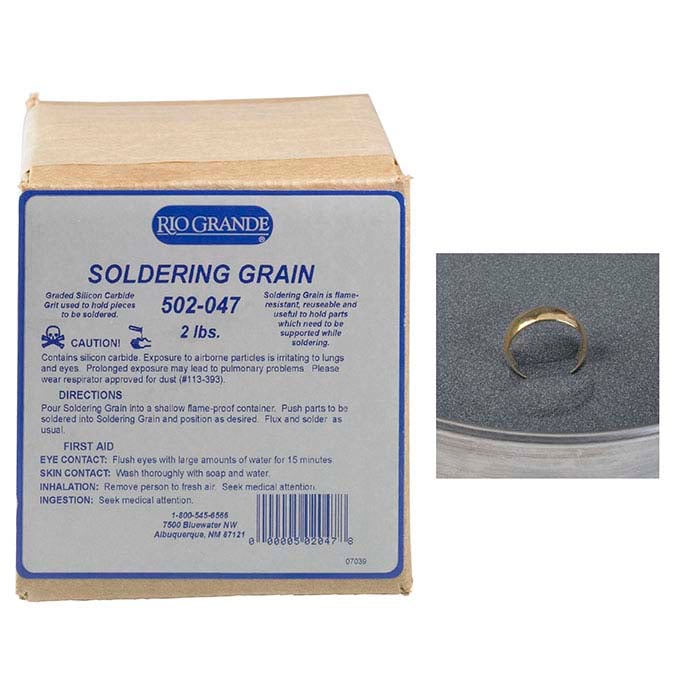 Position smaller parts in this fine reflective silicon carbide soldering grain. Odorless and re-usable, grain can be used wet (as a heat sink) or dry (to position parts). This product is designed for use with smaller, more delicate jobs; the force of a large torch flame will displace the material and interfere with its effectiveness. Non-contaminating; ideal for use with non-ferrous alloys. One package will fill a 7" annealing pan.