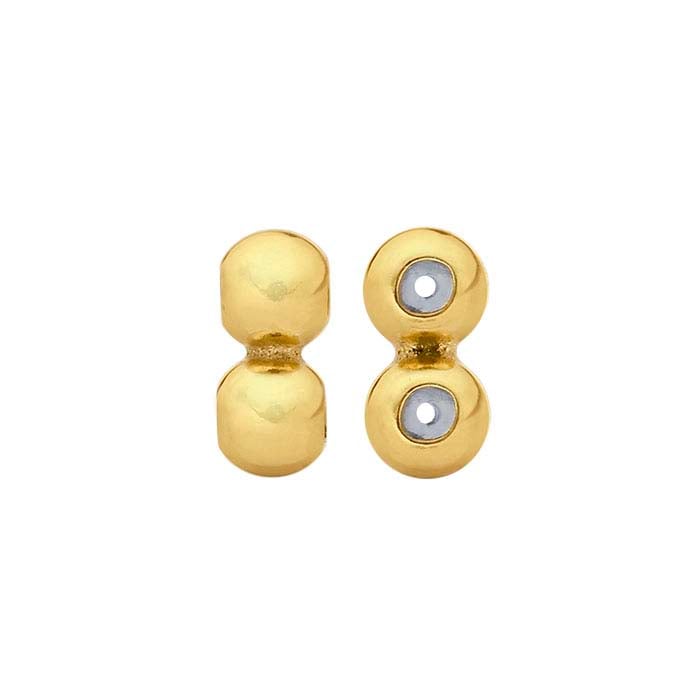 Ideale per design a doppio filo, questa doppia perla in oro 14/20 gold-filled presenta inserti in silicone che mantengono la perla aderente e in posizione sulle tue catene o cordini, ancorando le perle o fungendo da separatore di design per perle, ciondoli e/o altri componenti. Questa perla è placcata in oro giallo 14 carati per garantire un colore uniforme.
