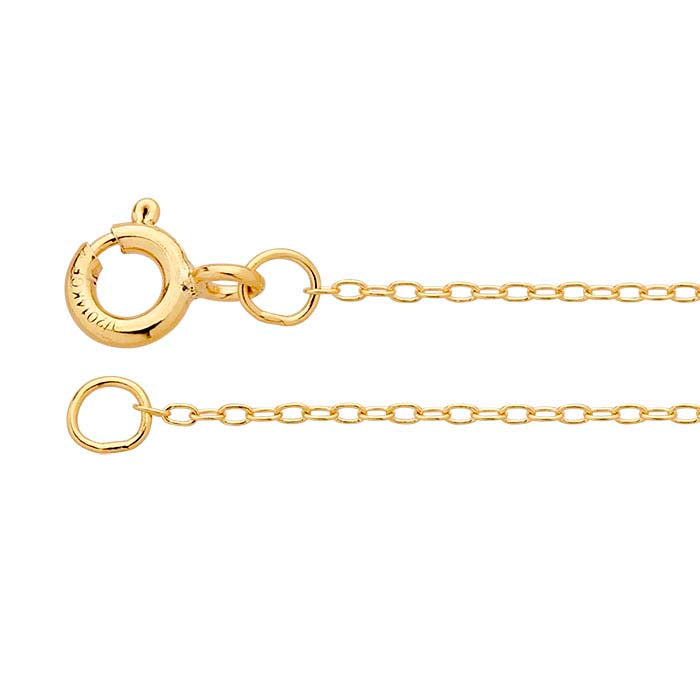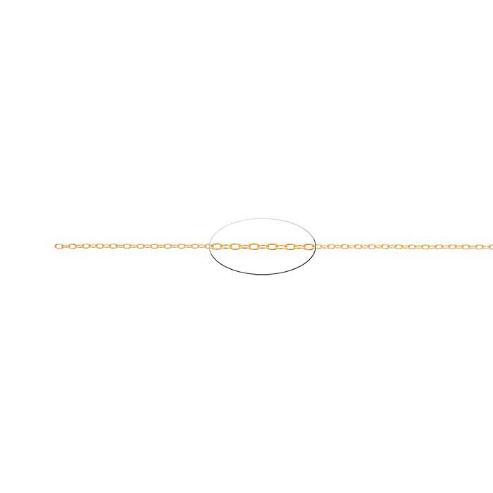 This lightweight 14/20 yellow gold-filled oval cable chain is the perfect backdrop for subtle, delicate designs. Offer it as-is, or add small charms, drops or dangles for a custom look. The chain is plated with 18-karat yellow gold.This chain is sold by the foot, so it's easy to get the length you need, when you need it.ow gold.The most common chain style, cable chains are formed by simply connecting single links perpendicularly end to end. Links may be round, oval or other shapes—the links of this chain are oval.This chain is sold by the foot, so it's easy to get the length you need, when you need it.