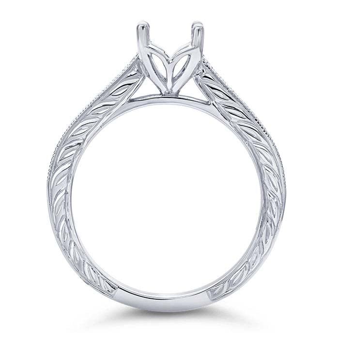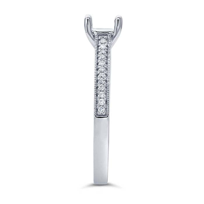 This 14-karat white gold ring features a 4-prong mounting that holds one 6.5mm (1-ct., approx.) round faceted gemstone. The shank features a milgrain edge and is set with 24 0.005-ct. round diamonds (SI clarity/G, H color; 0.125CTTW). Cut a seat in the prongs to accommodate your stone, then burnish the prongs over the stone to secure it in place.A classic choice, the 4-prong mounting supports the gemstone on four sides.