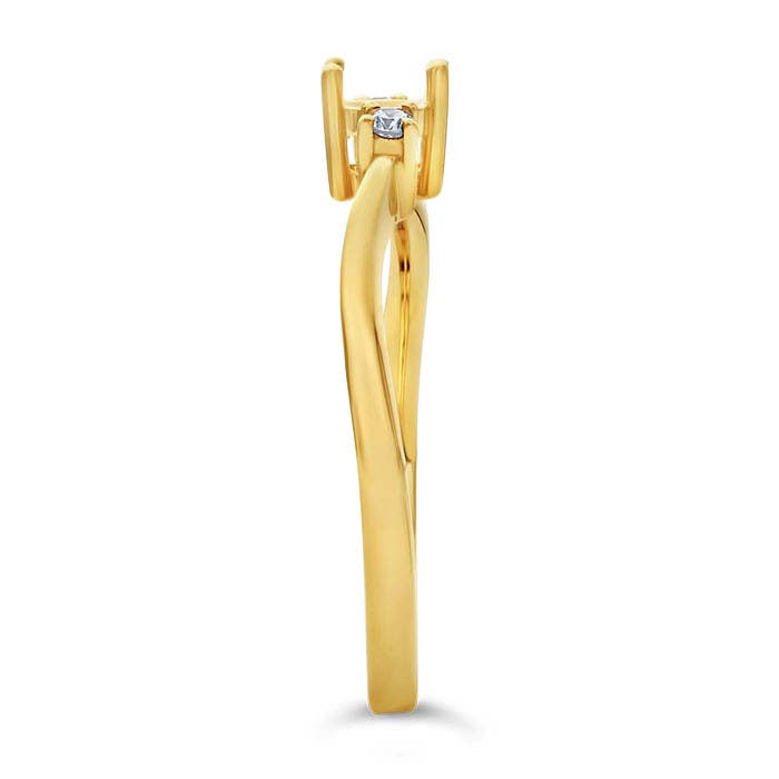 Questo anello in oro giallo 14 carati presenta una montatura a 4 griffe che sostiene una pietra preziosa sfaccettata rotonda da 5 mm (circa 1/2 ct.). Il gambo è impreziosito da due diamanti rotondi da 0,025 ct. ciascuno (purezza SI/colore G, H; 0,05CTTW), uno su ogni lato della montatura. Incidi una sede nelle griffe per adattare la tua pietra, quindi brunisci le griffe sopra la pietra per fissarla in posizione. Una scelta classica, la montatura a 4 griffe sostiene la pietra preziosa su quattro lati.