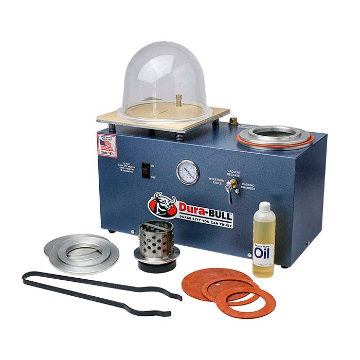 Dura-BULL® casting machines are made to last and deliver high-quality results with every cast. Manufactured in the USA.This versatile investing/casting machine offers a generous 11" x 11" (279.4 x 279.4mm) investment table and allows you to invest and cast perforated flasks up to 5” x 6”H (127 x 152.4mm) and solid flasks 4” x 7"H (101.6 x 177.8mm). It is also excellent for vacuuming RTV molds.• Built-in 1/2hp, 3cfm vacuum pump ensures a strong vacuum for more defect-free casting and investing. • Easy-access port makes it simple to add or change the oil. • Tough, durable components ensure a long life. • Includes 3.5" (88.9mm) and 4"(101.6mm) solid wall flask adapters.