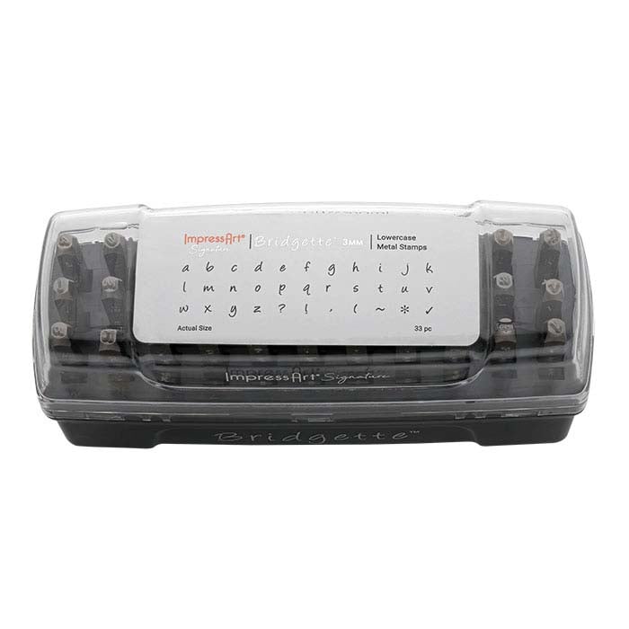 Quickly add decorative lettering or custom phrases to your jewelry designs with this ImpressArt® alphabet design stamp set. These stamps have straight shanks and are perfect for marking flat surfaces such as quality or brand tags, discs, stampings and other components. Each stamp is labeled on its side for easy identification and orientation. This set includes the complete alphabet (A–Z) plus seven additional shapes and punctuation marks and comes in a slotted case (6-3/4"W x 2-1/2"D x 3-1/4"H) with clear lid for easy, organized storage.