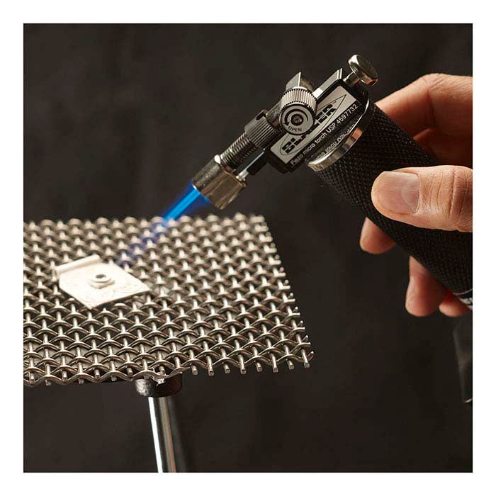 This metal clay torch firing kit allows you to control the firing process and create without a kiln. The mesh screens do not retain heat like some soldering pads do so you can control the heat that comes in contact with your piece. • Includes a blazer butane microtorch (shipped empty) with auto-ignition and a flame that’s easy to adjust with one hand. • Comes with a stainless steel 9" tripod, a 6" x 6" heavy-duty mesh screen and a 6" x 6" fine-mesh screen. • 150g (9-oz.) butane cartridges available separately (500181).