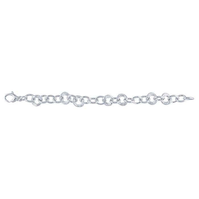 Large, hollow links with a subtle texture are scattered throughout the length of this sterling silver cable chain bracelet, making it a great choice for styles that call for a bold look but light weight. It can be worn as is, or paired with your choice of charms or drops for a one-of-a-kind look. The most common chain style, cable chains are formed by simply connecting single links perpendicularly end to end. Links may be round, oval or other shapes.
