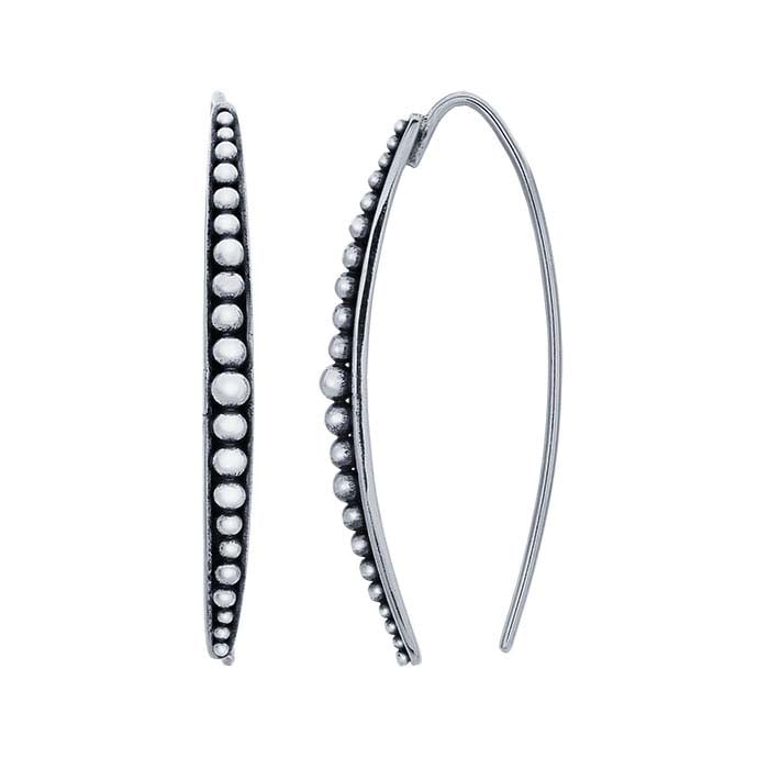 These finished sterling silver earrings feature a long shape with granulated beads against an oxidized background.