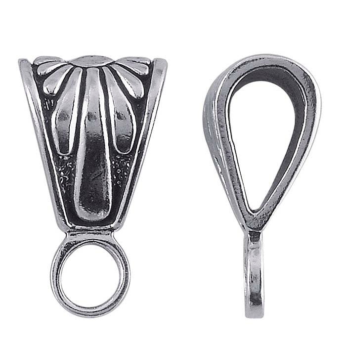 This tapered bail features a raised southwestern sun design that wraps around both sides of the bail. The background is oxidized and the size of the bail makes it perfect for use with thicker cords and chains. It is a great choice for adding an eye-catching detail to necklace designs. Attach a drop, dangle or other design component to complete the pendant.