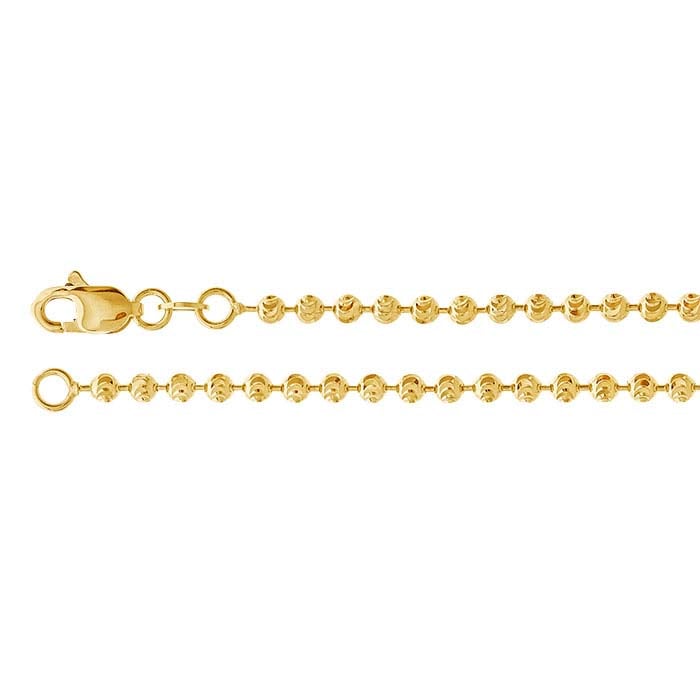 This 14-karat yellow gold chain features attractive moon-cuts that add a modern twist to the classic bead chain profile. Offer it as-is, or pair it with pendants, charms or drops for a one-of-a-kind look. Bead chain is characterized by spherical link, often hollow, that are joined by narrow connector wire or bars.